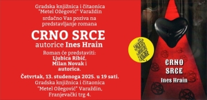 Gradska knjižnica i čitaonica "Metel Ožegović" Varaždin srdačno Vas poziva na predstavljanje romana Crno srce autorice Ines Hrain. Roman će predstaviti Ljubica Ribić, Milan Novak i autorica. Četvrtak, 13. studenoga 2025. u 19 sati. Gradska knjižnica i čitaonica "Metel Ožegović" Varaždin, Franjevački trg 4.
