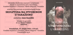 Hrvatska akademija znanosti i umjetnosti, Zavod za znanstveni rad u Varaždinu i Gradska knjižnica i čitaonica "Metel Ožegović" Varaždin srdačno Vas pozivaju na predstavljanje knjige Skulptura na otvorenom autorice Ane Kaniški. O knjizi će govoriti dr. sc. Sanja Cvetnić i autorica. Ponedjeljak, 23. ožujka 2026. u 18 sati u Gradskoj knjižnici i čitaonici "Metel Ožegović" Varaždin, Franjevački trg 4.