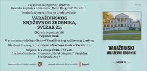 Varaždinsko književno društvo i Gradska knjižnica i čitaonica „Metel Ožegović“ Varaždin imaju čast pozvati Vas na predstavljanje VARAŽDINSKOG KNJIŽEVNOG ZBORNIKA SVEZAK 25. Zbornik će predstaviti Tugomir Orak. U programu sudjeluju članovi Varaždinskog književnog društva. Glazbeni dio programa: učenici Glazbene škole u Varaždinu. Donatori: Varaždinska županija i Bomark ambalaža Srijeda, 6. svibnja 2026. u 19 sati. Gradska knjižnica i čitaonica „Metel Ožegović“ Varaždin, Franjevački trg 4.